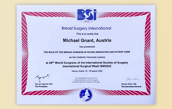 Am 17. August 2022 wurde Univ.-Prof. Dr. Michael Gnant im Zuge der International Surgical Week 2022 in der Wiener Hofburg von BSI-Präsidenten Prof. Gaurav Agarwal mit dem Umberto Veronesi Preis geehrt. Lesen Sie mehr